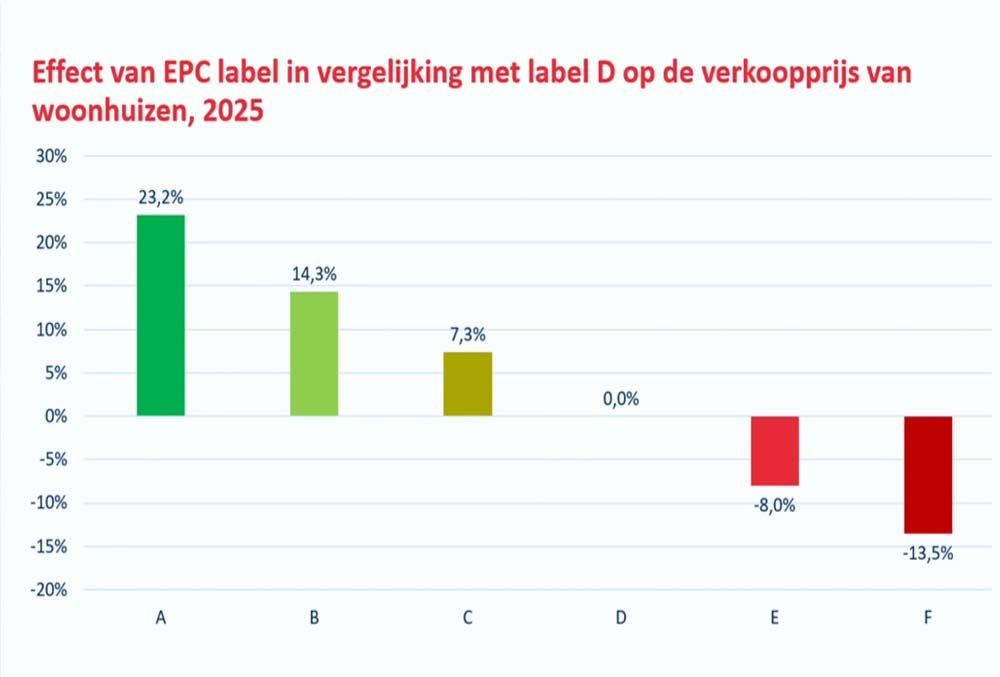 Ondanks het feit dat huizen met de slechtste EPC-labels dus opnieuw in prijs stijgen, groeit de kloof wel tussen de labels C en D en de labels E en F in vergelijking met 2024. Een woning met label F is 13,5% goedkoper dan een woning met label D, de huidige norm. Voor een woning met label E betaal je gemiddeld 8% minder. Een woning met label C daarentegen is 7,3% duurder, een label B kost 14,3% meer en de meest energiezuinige panden met label A komen uit op 23,2% extra.