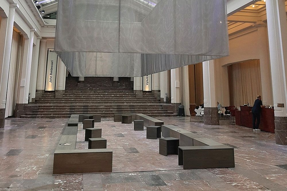 Deze combinatie verzoent de akoestische hardheid van het marmer met een warmere sfeer, bevorderlijk voor gesprekken, ontmoetingen en performances.