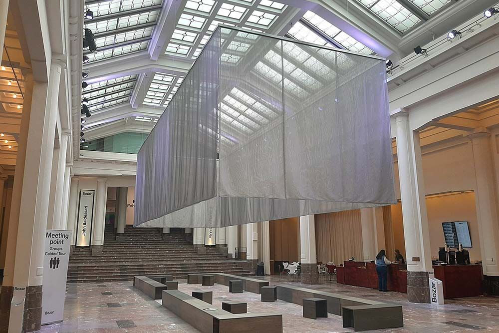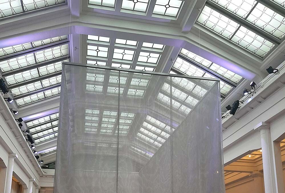 “De monumentaliteit is sterk aanwezig op deze plek. Ik wilde een verticaliteit creëren tussen het glazen dak en de marmeren vloer, tussen licht en steen. De sluier wordt een beweegbare kamer, die men kan op- of neerhalen, en die het idee van beweging introduceert in deze immense minerale ruimte,” voegt Michel François toe.