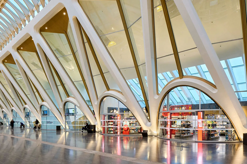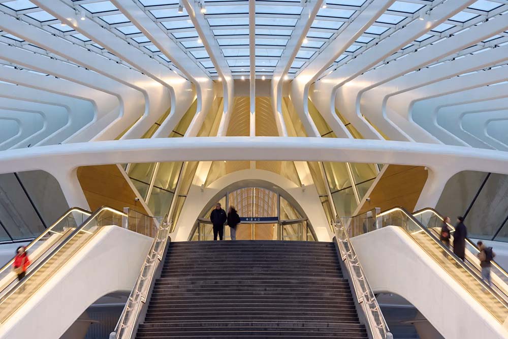 Vanaf het perron neem je dan de (rol)trap of lift naar boven om in het stationsgebouw te komen. Direct moesten we denken aan de Oculus in New York City, misschien wel het bekendste ontwerp van Calatrava. De skeletachtige structuur en de prachtige lichtinval geven je het gevoel dat je op een bijzondere plek bent. Futuristisch en buitenaards zijn een paar van de associaties die bij je opkomen. Ook het gevoel dat je door de ribbenkast van een reusachtige skelet loopt, komt bovendrijven. De winkels en koffiezaken achter een façade van fraai golvend glas doen je beseffen dat je gewoon in een Belgische stad bent aangekomen. Een grappig tegenstrijdig gevoel.