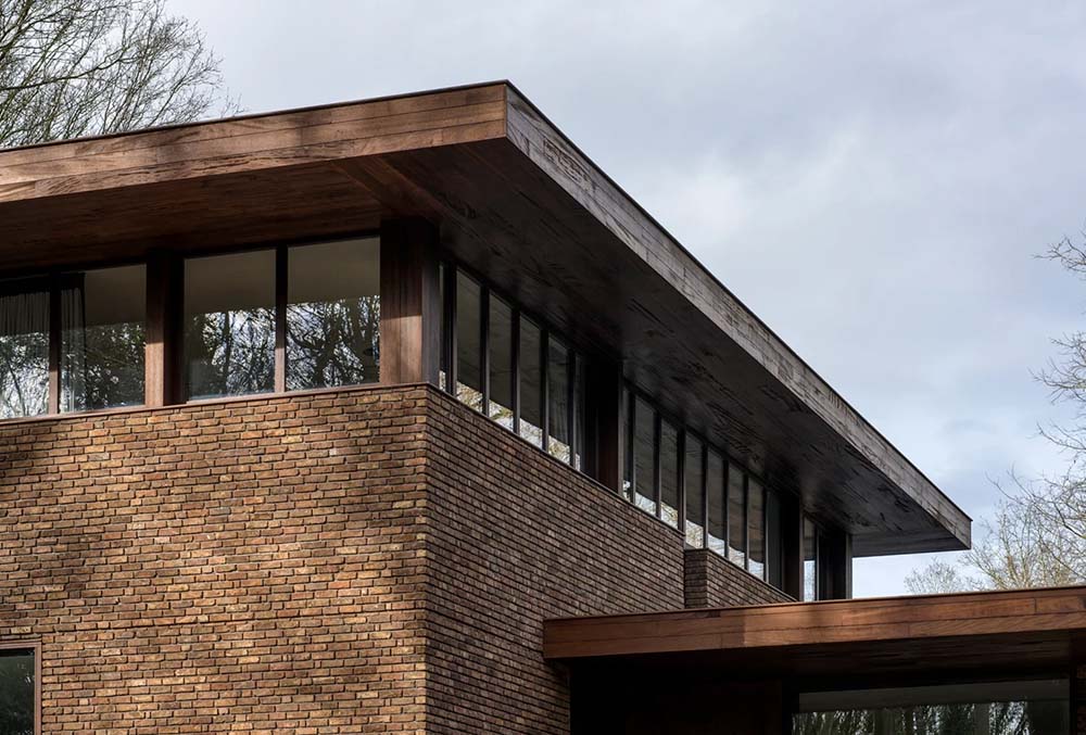 Het huis, gelegen op een verhoogde open plek, ontvouwt zich tussen dichtheid en openheid – de ene kant solide en beschermend, de andere kant gericht op licht, met luifels die zich uitstrekken over buitenruimtes en een zwembad. Gerecyclede bakstenen van een 200 jaar oud waterreservoir en essenhouten panelen geven de aardse tinten en texturen van het bos weer. Hun samenspel van ruwe en gladde oppervlakken roept het organische modernisme van Wright en de gelaagde horizontaliteit van traditionele Japanse tempels op.