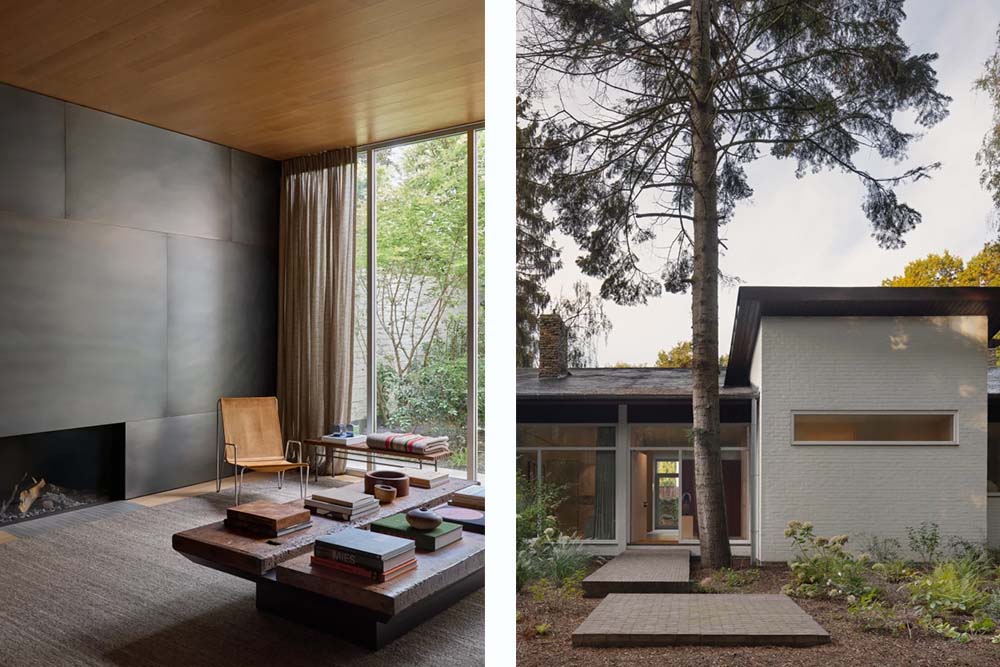 De veranderingen aan de buitenkant waren minimaal maar nauwkeurig: een verplaatste ingang, een herwerkte raamcompositie en een aangepaste daklijn versterken de horizontaliteit. Binnenin werd de indeling gereorganiseerd om drie slaapkamers en een open leefruimte te integreren, met de nadruk op daglicht en de verbinding met de omliggende bossen.