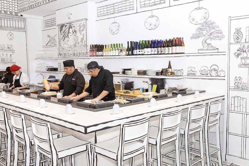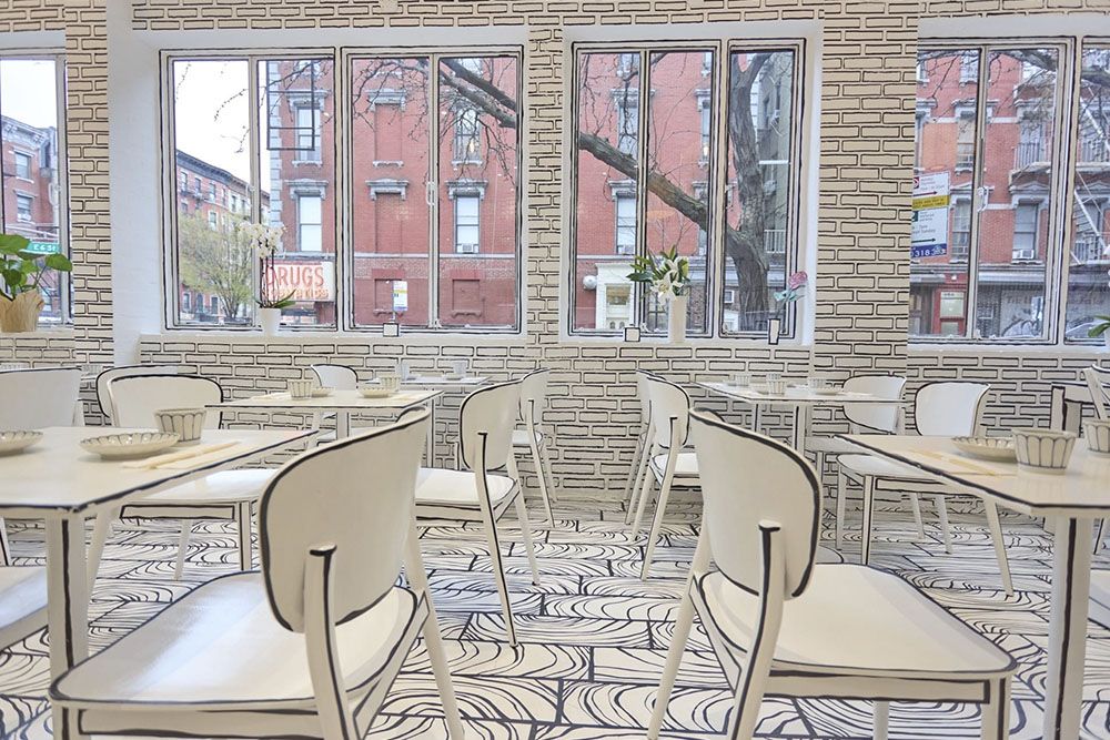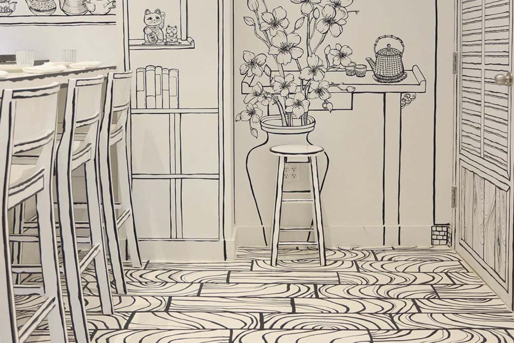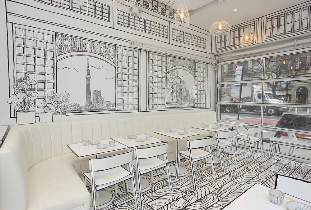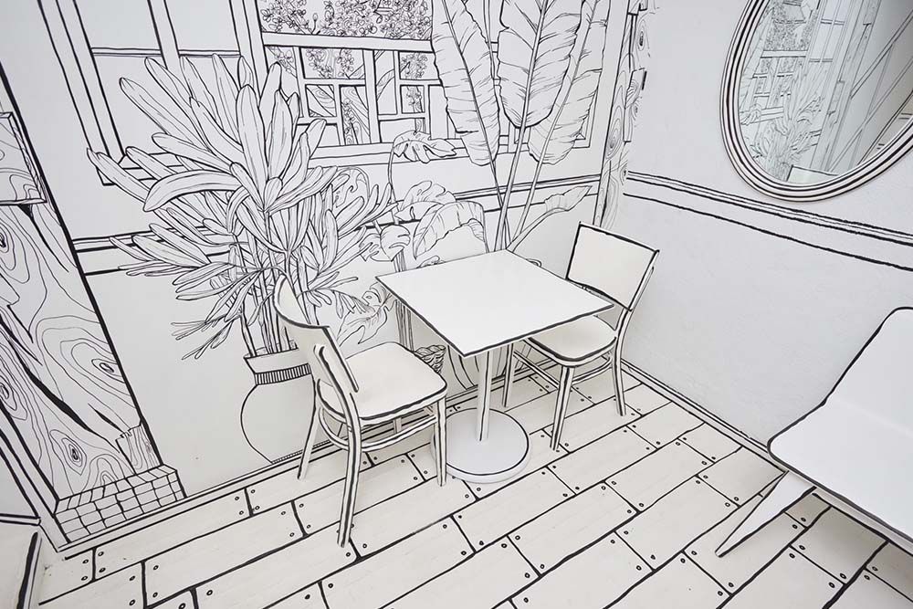 Het idee is overigens niet origineel. De eigenaren van Shirokuro (de naam is Japans voor zwart-wit) lieten zich inspireren door Cafe Yeonnam-dong in Seoul. Dat neemt niet weg dat de uitvoering spectaculair is. Kunstenaar en art director Mirim Yoo tekende alles in het interieur persoonlijk met de hand. Er is bewust voor gekozen om niet met prints of behang te werken. Met deze klus was ze in totaal drie maanden bezig.