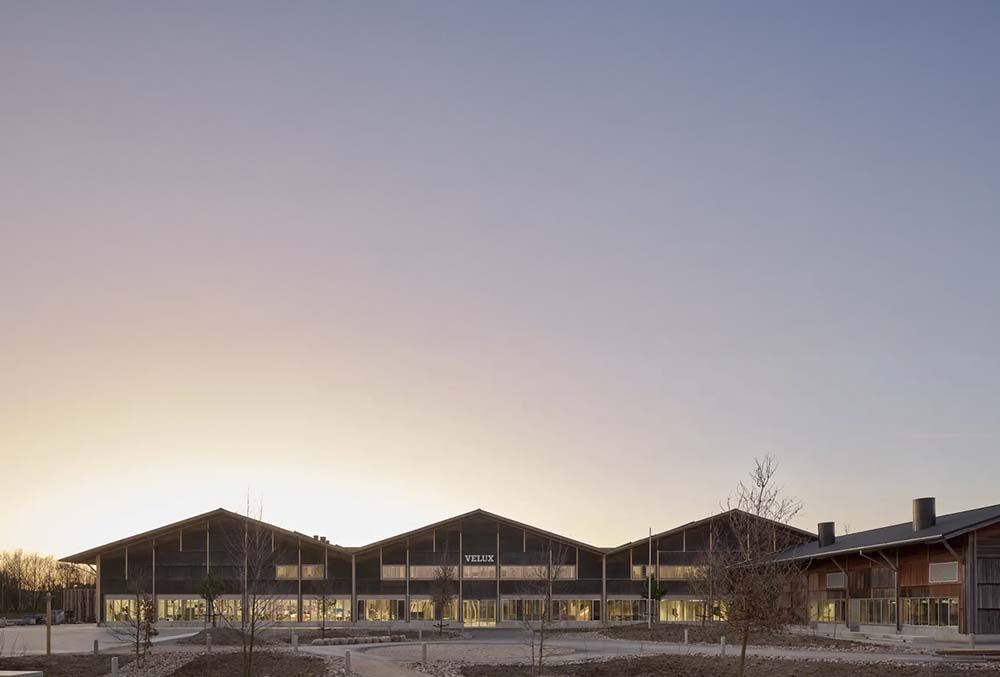 In het hart van de historische productiesite van de VELUX-groep in Denemarken is een oud houten magazijn uit 1995 omgevormd tot het LKR Innovation House. Dit gebouw van 14.000 m², geopend in het voorjaar van 2025, brengt bijna 500 medewerkers samen en fungeert zowel als technologische etalage, productlaboratorium als demonstratie van grootschalige duurzame renovatie.