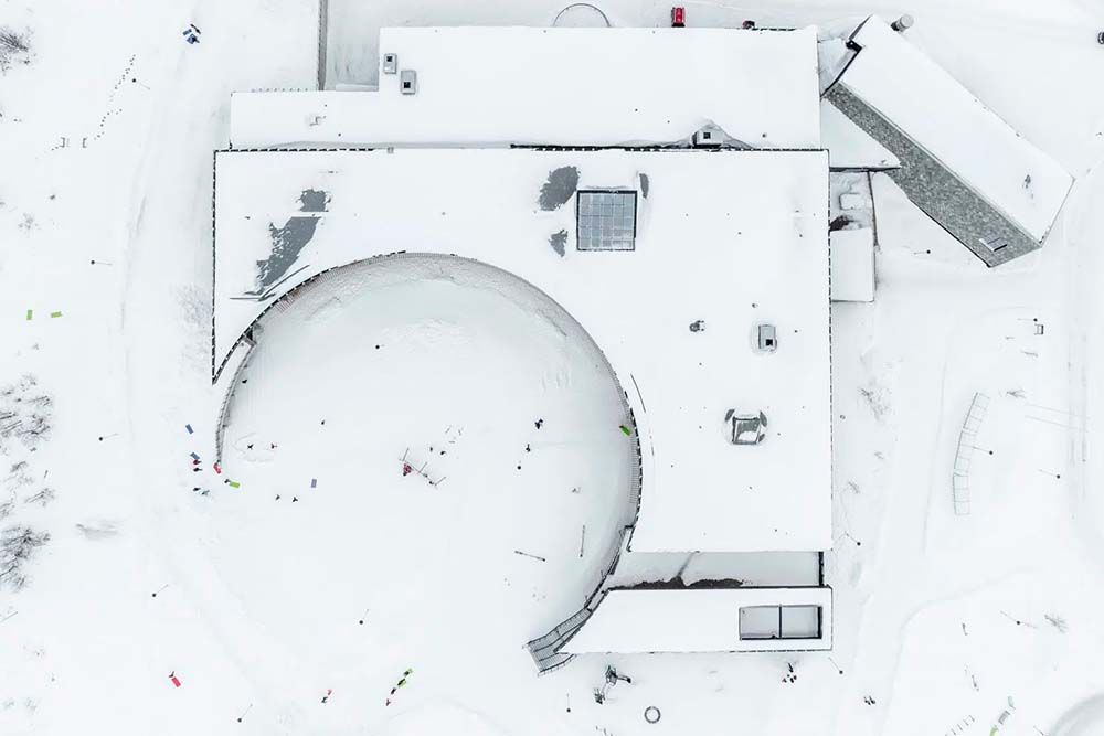 De cirkelvormige buitenruimte, die door het gebouw zelf wordt gevormd, is het belangrijkste architectonische kenmerk van het project en het ‘externe hart’ van de school. Op het snijpunt tussen de hoofdingang en de cirkelvormige buitenruimte ligt het interne hart. Een sculpturaal amfitheater dient als verzamelpunt en de ruimte strekt zich uit over twee verdiepingen. Een groot, rond dakraam laat licht binnen.