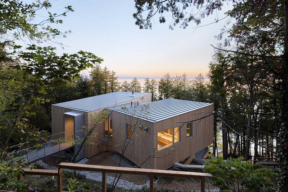 “Elk programmatisch volume roteert om zich te aligneren met bestaande openingen in het boomdak, waardoor weidse uitzichten op Lake Huron worden gekaderd,” zegt Omar Gandhi, oprichter en partner. “Subtiele verschuivingen en variaties creëren een ritme langs de helling, waarbij elke binnenruimte een unieke relatie aangaat met het omliggende bos.”