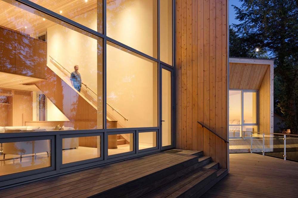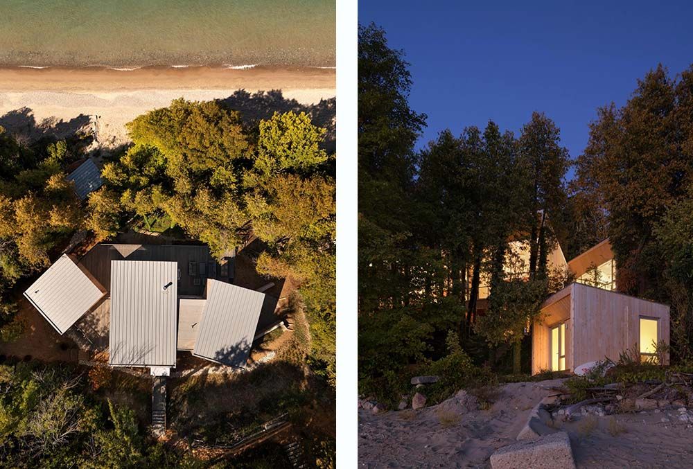 De residentie bestaat uit een hoofdwoning en een reeks kleinere structuren, waaronder een gastenverblijf en een strandpaviljoen, samen goed voor 5.000 vierkante voet aan programma, verspreid over het terrein. Ontworpen in dezelfde vormentaal als de centrale woning, breiden deze bijgebouwen het project uit in het landschap. Elk volume roteert subtiel om zich te aligneren met bestaande openingen in het boomdak, waardoor weidse zichten op Lake Huron worden gekaderd en tegelijkertijd de integriteit van het omliggende bos behouden blijft. Deze zachte verschuivingen creëren een ritmische compositie langs de helling, waarbij elke binnenruimte een eigen relatie aangaat met licht, bomen en water.