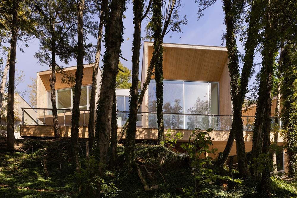 Grote openingen vangen het daglicht en richten de aandacht naar buiten, met zowel gefilterde doorkijken door de takken als weidse panorama’s daarachter. Het resultaat is een architectuur die tegelijk precies en speels is, zich aanpast aan het terrein en de verbinding tussen binnen en buiten versterkt. Tussen de volumes steken open terrassen uit in de bosrand, waardoor een brug ontstaat tussen het interieur en het boomdak.