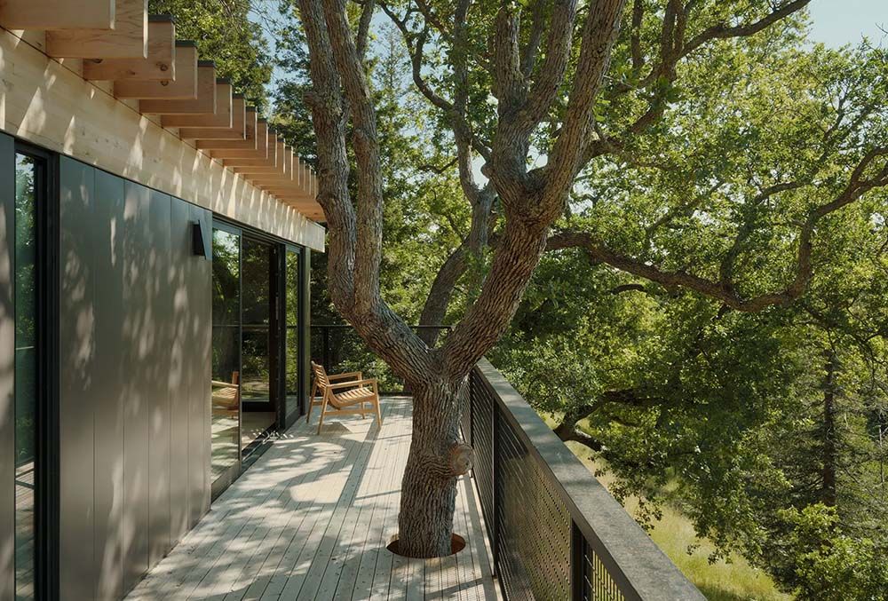 Onder de naam ‘Paviljoen in de eiken’, realiseerde Mork-Ulnes Architects een project in Monte Sereno, California (VS) dat een uitbreiding betreft van een woning op een heuvel uit de jaren ‘70. Het gebouw is tegenover de bestaande woning geplaatst. Hierdoor ontstaat een driezijdige, open binnenplaats die fungeert als de belangrijkste zomerontmoetingsplaats. Het paviljoen is ontworpen als een toevluchtsoord voor de eigenaar. Tevens fungeert het als een ontmoetingsplek. Daarbij biedt hij naast het gezinsleven ruimte voor yoga, beweging en wellness.