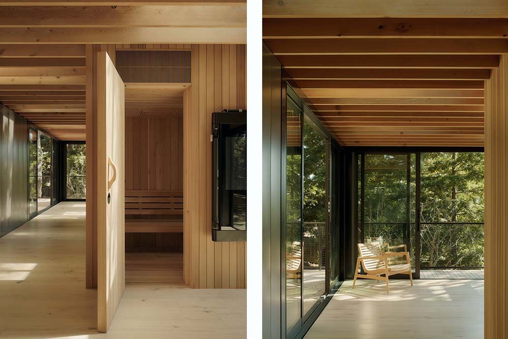 Het interieur van het paviljoen is georganiseerd rond een centraal, cederhouten volume, omgeven door bedienbare schuifdeuren. De dakconstructie bestaat uit een zichtbaar cederhouten frame, dat gevlekt licht filtert en projecteert vanuit negen dakramen bovenin naar de ruimte eronder. Hierdoor ontstaat het gevoel dat de bewoner of bezoeker onder de eiken en sequoia’s zit.