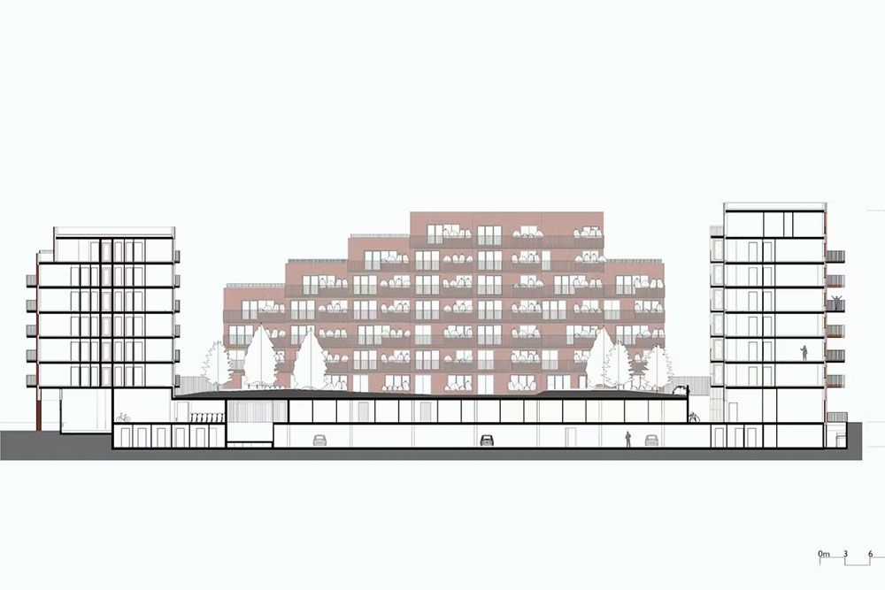 In het midden van het blok ligt een binnentuin die is ingericht als open, groene ruimte. Door het noordblok los te koppelen van het carré valt er meer daglicht binnen en ontstaat een lichte binnentuin die toegankelijk is voor bewoners. Het groen loopt via terrassen en geïntegreerde plantenbakken door naar de hogere verdiepingen, waardoor een visuele verbinding ontstaat tussen binnen en buiten. De tuin fungeert als gezamenlijke buitenruimte waar bewoners kunnen verblijven of wandelen.