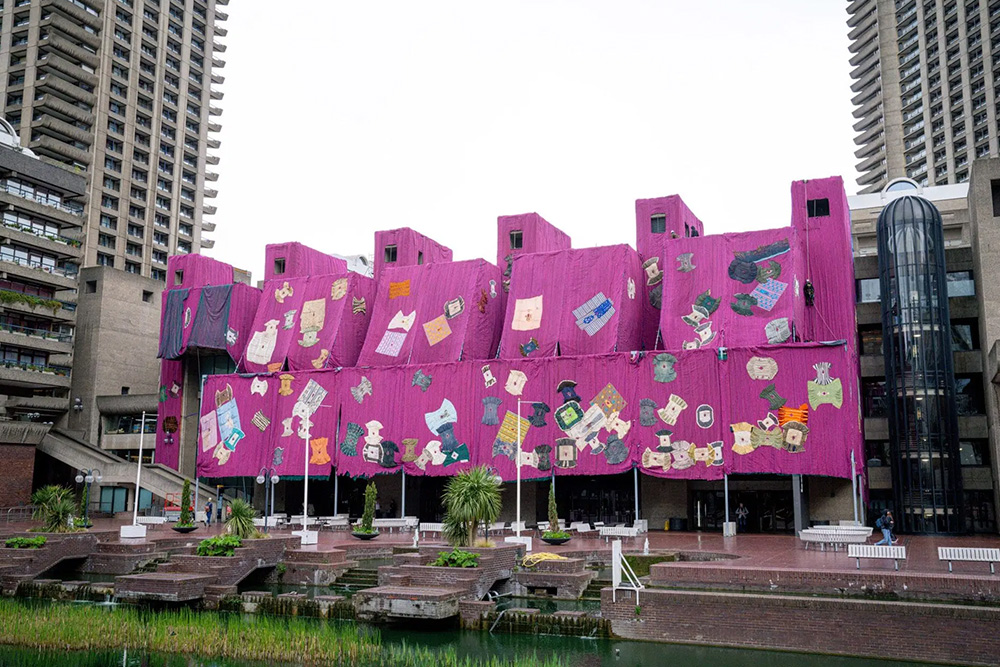 De bijzondere architectuur van het Barbican in Londen is door de Ghanese kunstenaar Ibrahim Mahama op opvallende wijze onder handen genomen. Tot en met 18 augustus 2024 heeft het brutalistische gebouw een roze jas aan.