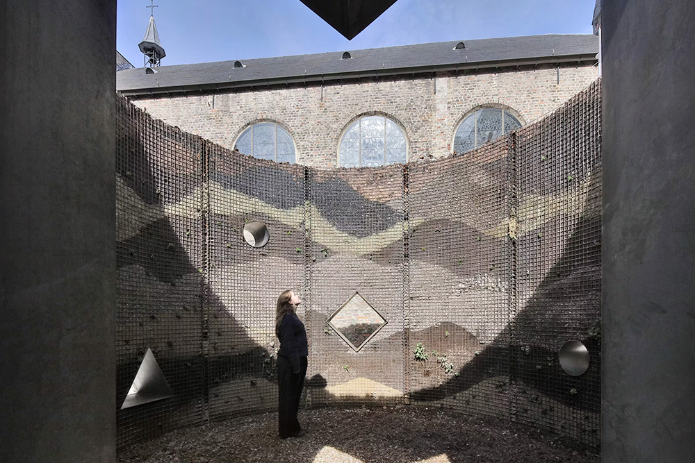 Een trechter uit 3D-geprint textiel van PET-flessen, een dertiende-eeuws binnenplein gewrapped in zilverkleurige gordijnen en een 6 meter brede silo als ecosyteem.