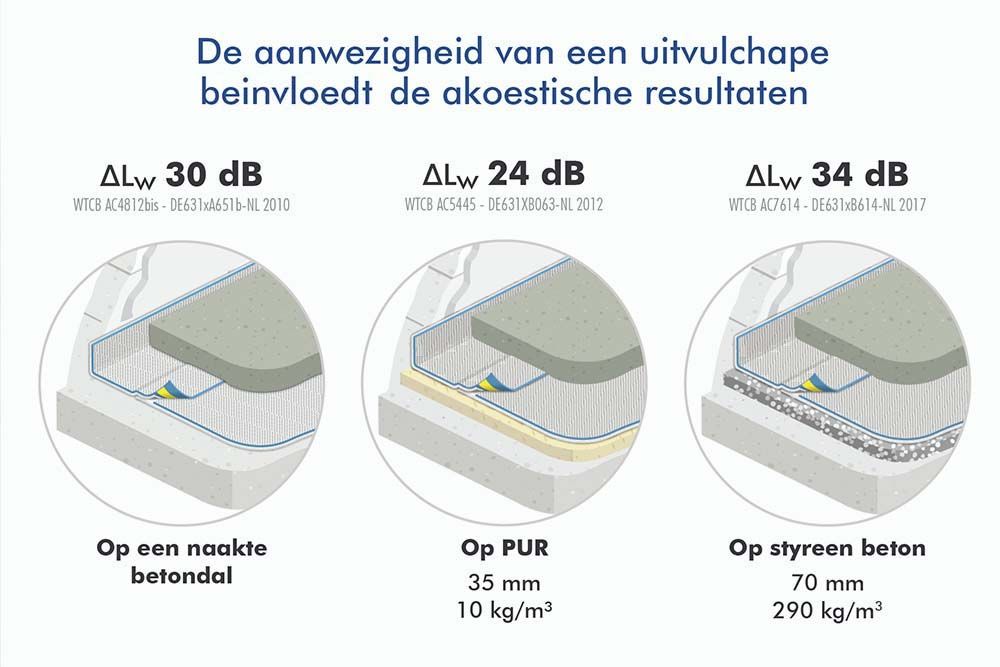 Een uitvulchape die de technische leidingen bedekt, ook zorgt voor thermische isolatie en een akoestische isolatie tussen verdiepingen aanbiedt lijkt misschien ideaal. Of het nu gaat om gespoten PUR, een mengeling met EPS korels of schuimbeton, er bestaat echter geen enkele uitvullaag die in zijn eentje toelaat op een voldoende manier te beantwoorden aan de akoestische eisen tussen verdiepingen.