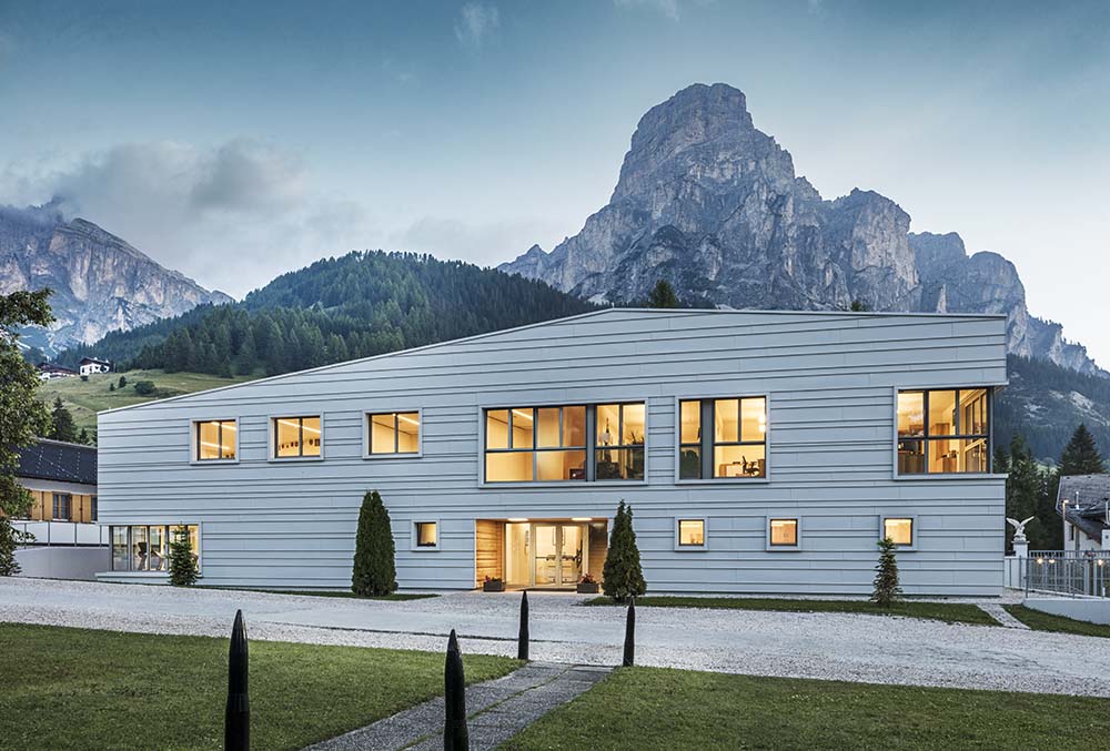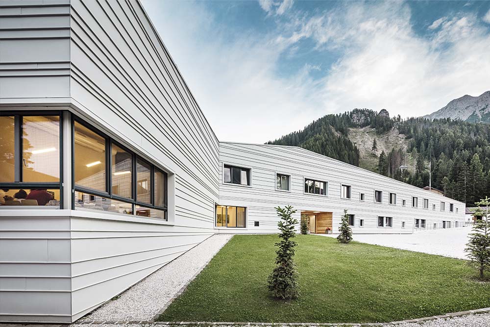De architecten kozen bewust voor een vormentaal die contrasteert met traditionele bergarchitectuur. In plaats van hout en steen overheersen strakke lijnen en lichte gevels in PREFALZ aluminium (P.10 Prefawit). De keuze voor wit is zowel esthetisch als technisch: het hoge reflectievermogen van het aluminium beperkt opwarming door de intense bergzon en draagt bij aan een aangenaam microklimaat. Zo ontstaat een gebouw dat in de winter naadloos opgaat in de besneeuwde omgeving en in de zomer helder contrasteert met groene alpenweiden.