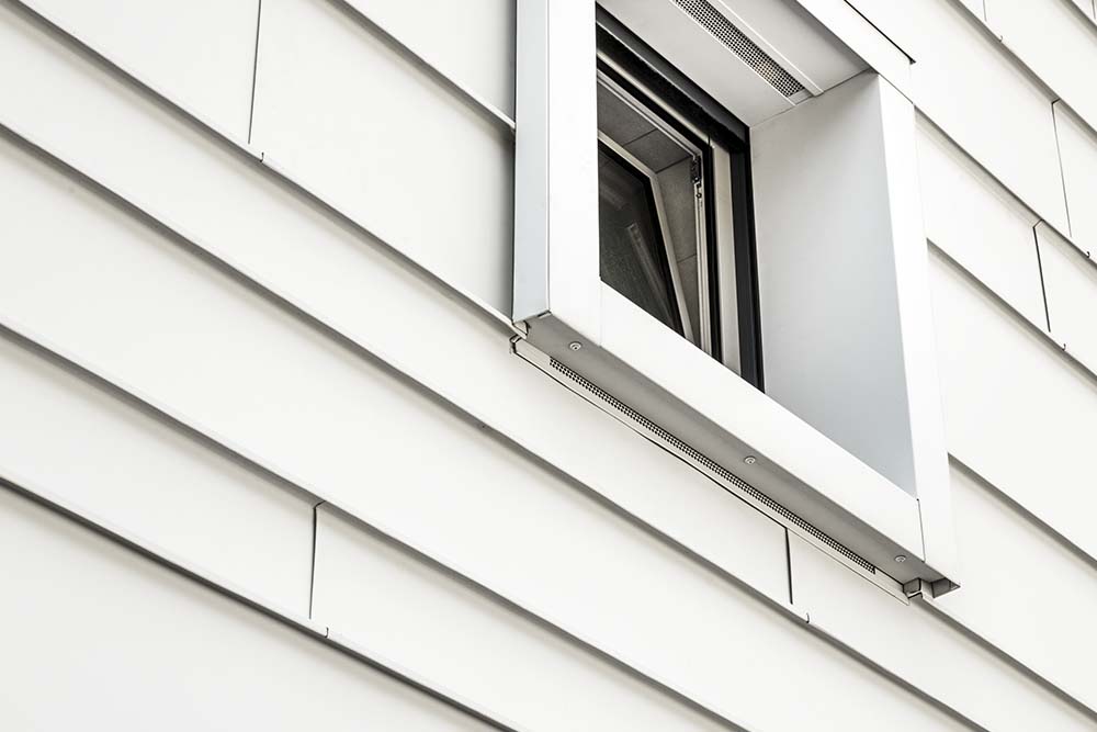 De uitvoering stelde hoge eisen aan precisie. In enkele maanden tijd zijn 1.700 m² dak en 2.100 m² gevel gerealiseerd. De PREFALZ banen werden in de werkplaats op maat geproduceerd, in horizontale richting gelegd en gevarieerd in breedte. Het resultaat is een subtiel ritme, versterkt doordat elk raam zorgvuldig aansluit bij de vouwlijnen van het metaal. Dit raster verleent de lange bouwvolumes een duidelijke structuur en schaal.