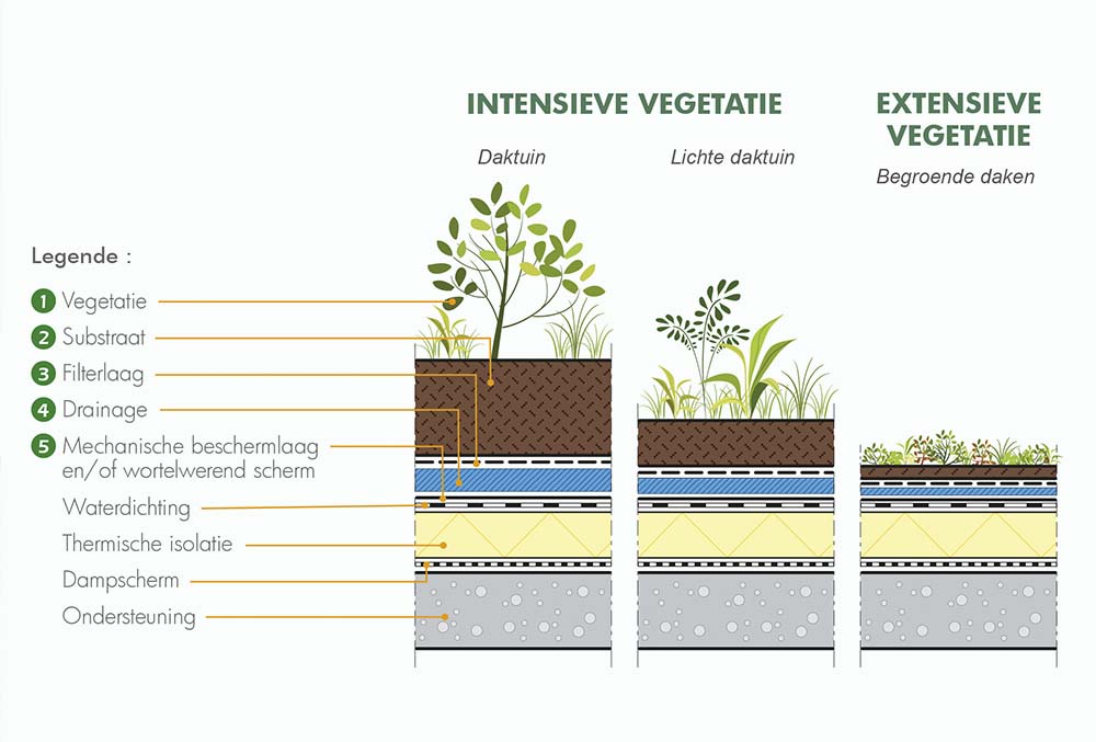 Extensieve groendaken zijn licht en dun, met een lage begroeiing die weinig onderhoud vraagt. Intensieve groendaken zijn dikker en gevarieerder, lijken meer op een klassieke tuin en bieden meer vrijheid in ontwerp en gebruik.