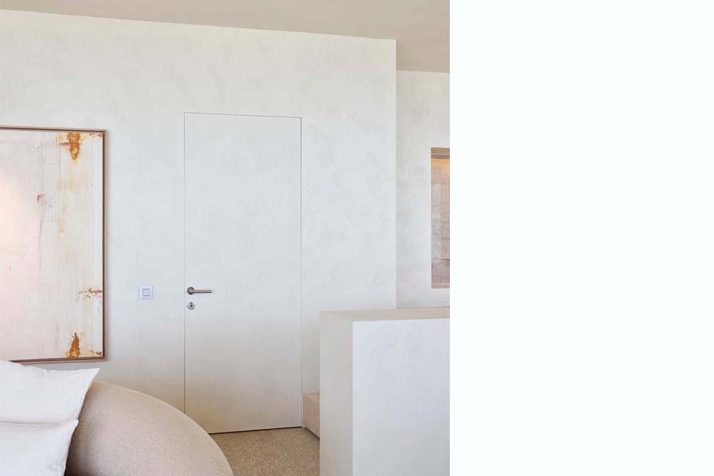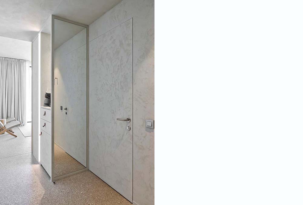 Bij een geslaagde hotelervaring hoort een serene badkamer. In Silt krijg je een stijlvolle toegang tot die badkamer. Het deurkader invisidoor 2.0 is zorgvuldig ingewerkt in de wand. De scharnieren en het slot zitten in het ingewerkte U-profiel. Daardoor ligt het deurblad perfect in het vlak en blijft enkel de voeg tussen de deur en het deurkader zichtbaar. Over een vloeiende overgang gesproken. Bovendien leent het basisprofiel zich zowel voor links- als rechtsdraaiende deuren. De draairichting van de deur is dus op elk moment nog eenvoudig te wijzigen, zelfs na het pleisterwerk.
