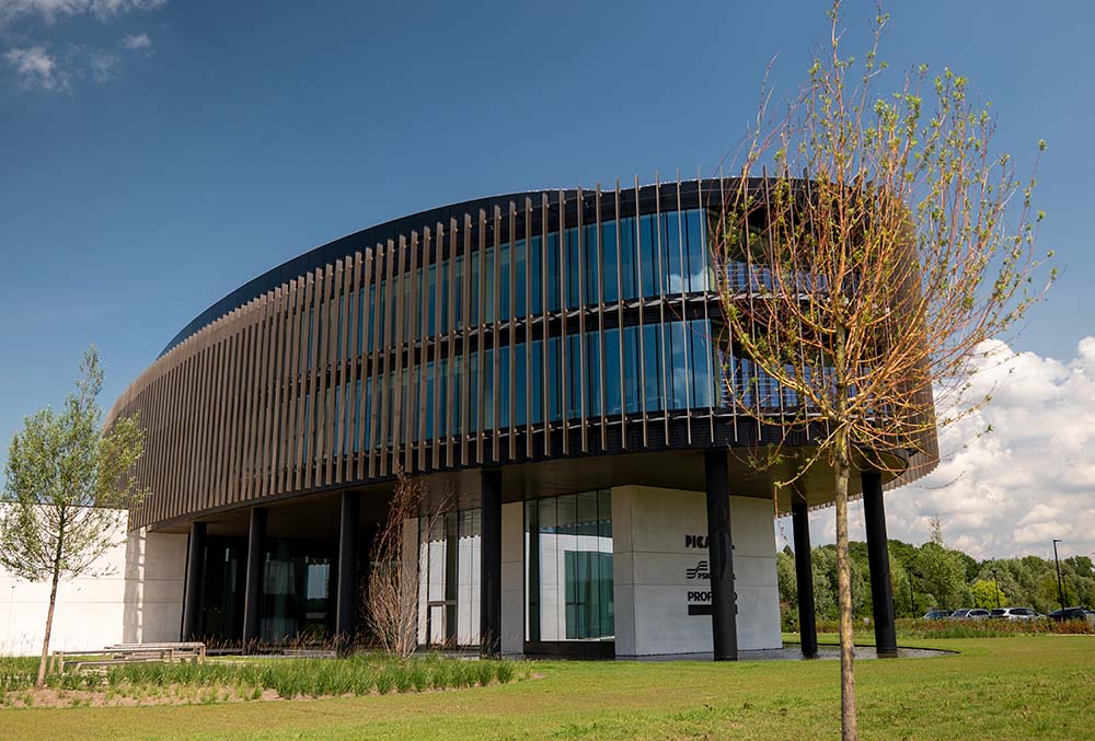 In Ieper verrijst een nieuw herkenningspunt: het hoofdkantoor van Picanol Group. Een gebouw dat niet zomaar kantoren huisvest, maar een verhaal vertelt – van innovatie, precisie en licht. De elliptische spoelvorm, glanzend in goud, lijkt te ademen met het daglicht. Die levendige gevel dankt zijn karakter aan één subtiel maar bepalend element: de DucoSun Cubic lamellen van DUCO.