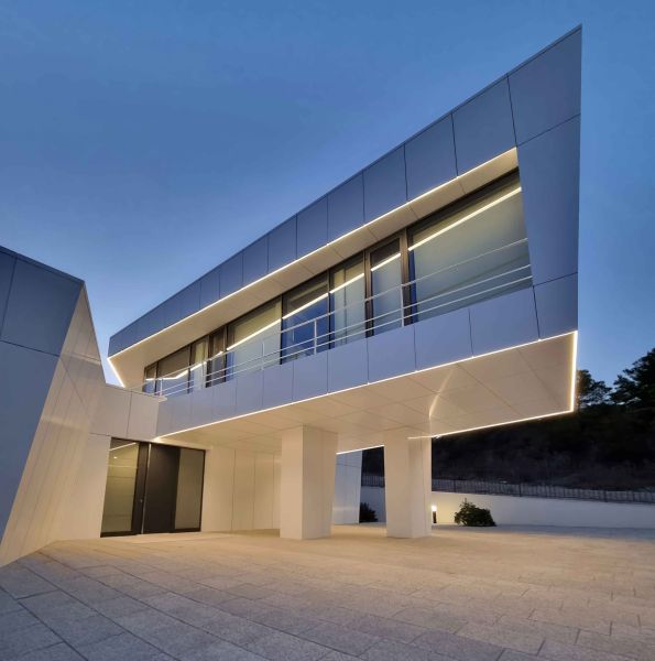 De gevel speelt een centrale rol in het ontwerp en werd uitgevoerd in Kerrock solid surface platen. Witte panelen zijn onder verschillende hoeken geplaatst en opgebouwd, wat resulteert in een dynamisch, sculpturaal geheel met een duidelijke verwijzing naar maritieme vormen. De afwisseling van vlakken en lijnen creëert een subtiel spel van schaduw en diepte, waardoor de gevel gedurende de dag een voortdurend veranderend karakter krijgt. In combinatie met de uitkragende volumes versterkt dit het beeld van een architectuur die lijkt te zweven boven het terrein.